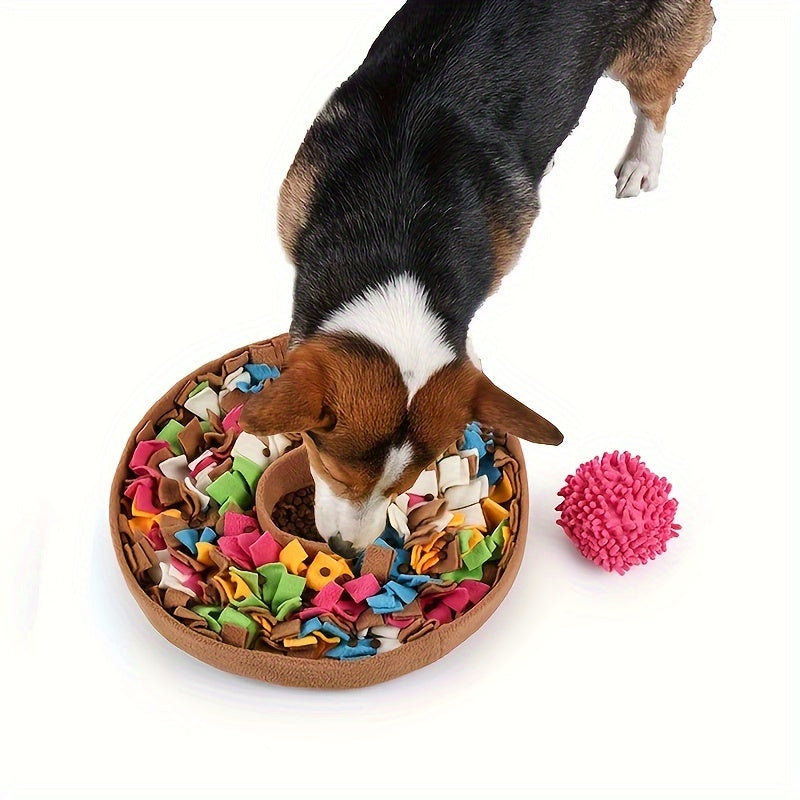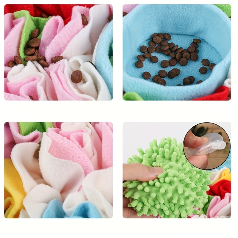 Ce tapis de fouille pour chien, en tissu doux et antidérapant, stimule l'odorat tout en ralentissant les repas. Centre sonore, couleurs vives, lavable et durable.
