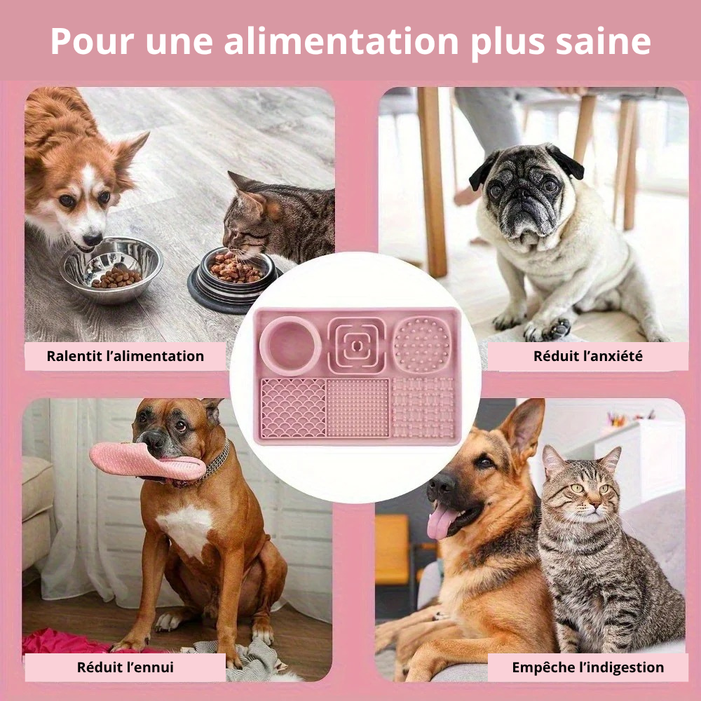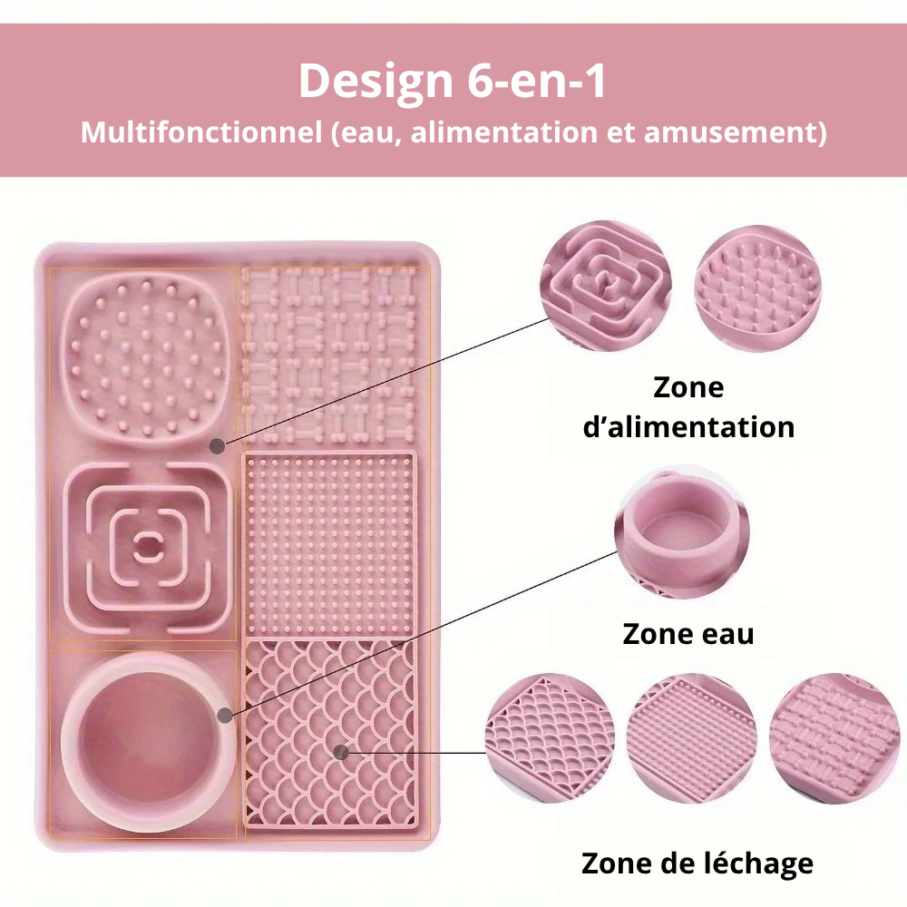 Tapis de léchage en silicone durable, parfait pour les chiens anxieux. Grâce à ses 6 zones différenciées, il améliore la digestion et réduit l’ennui. Gamme multifonction.