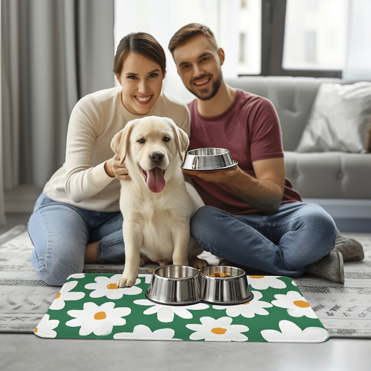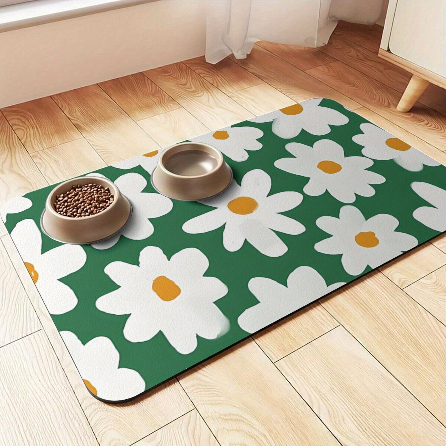 Ce tapis gamelle imperméable au motif jardin marguerite est antidérapant, facile à nettoyer et protège vos sols avec style pendant les repas de votre chien.