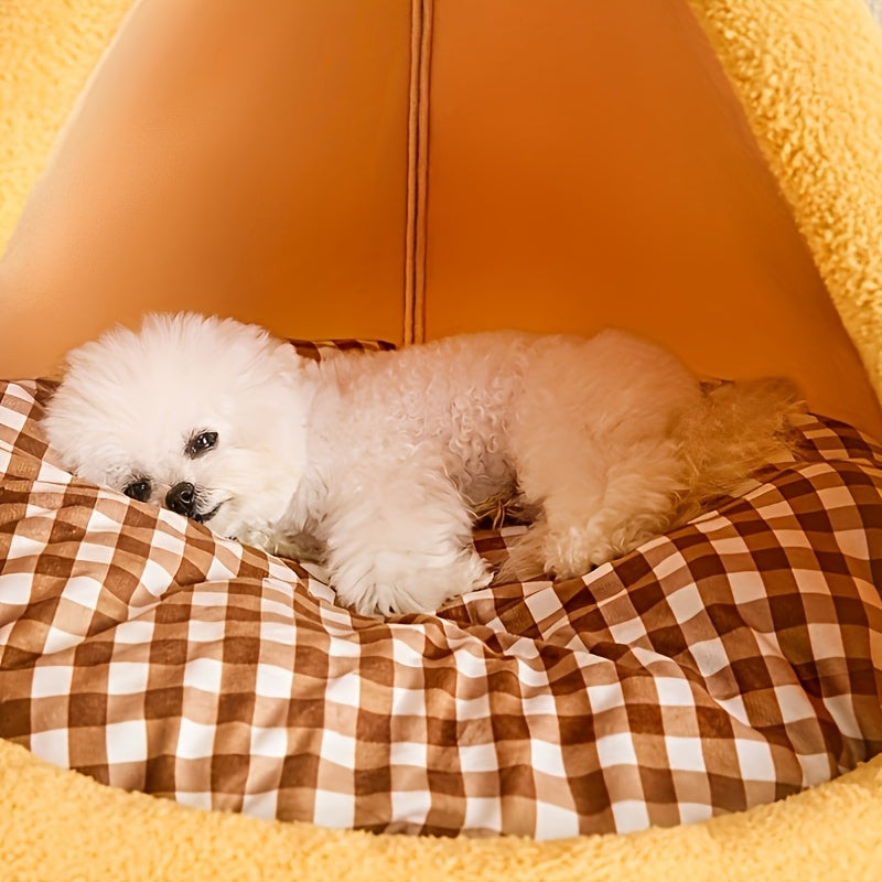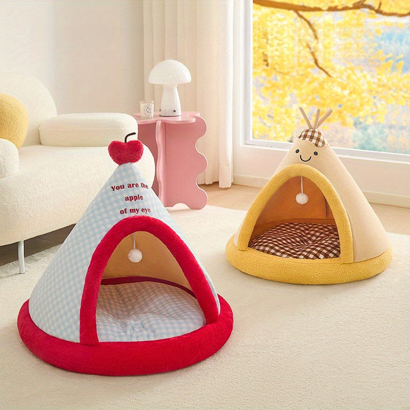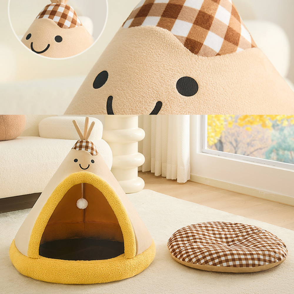 Une tente pour petit chien ou chat en coton doux, au design tipi fermé. Un abri douillet et sécurisé avec coussin moelleux pour un confort en toute saison.