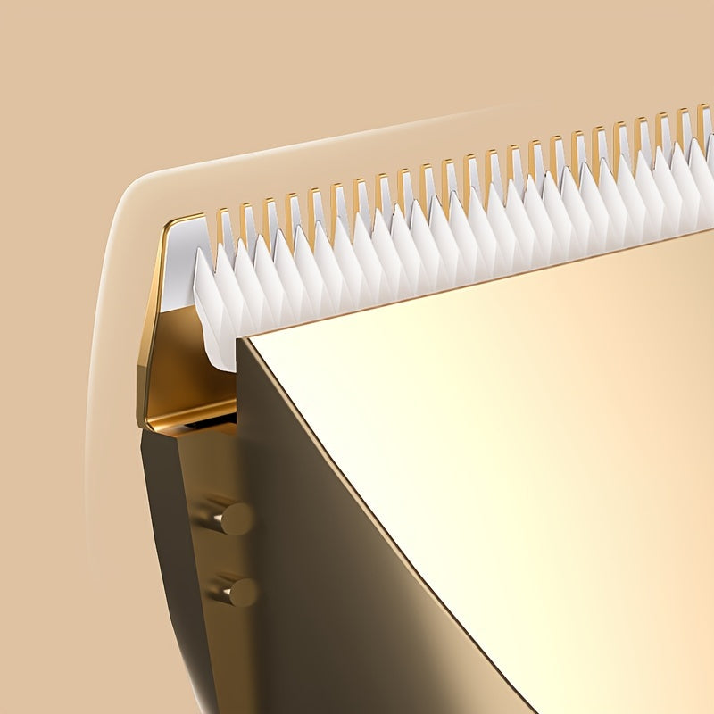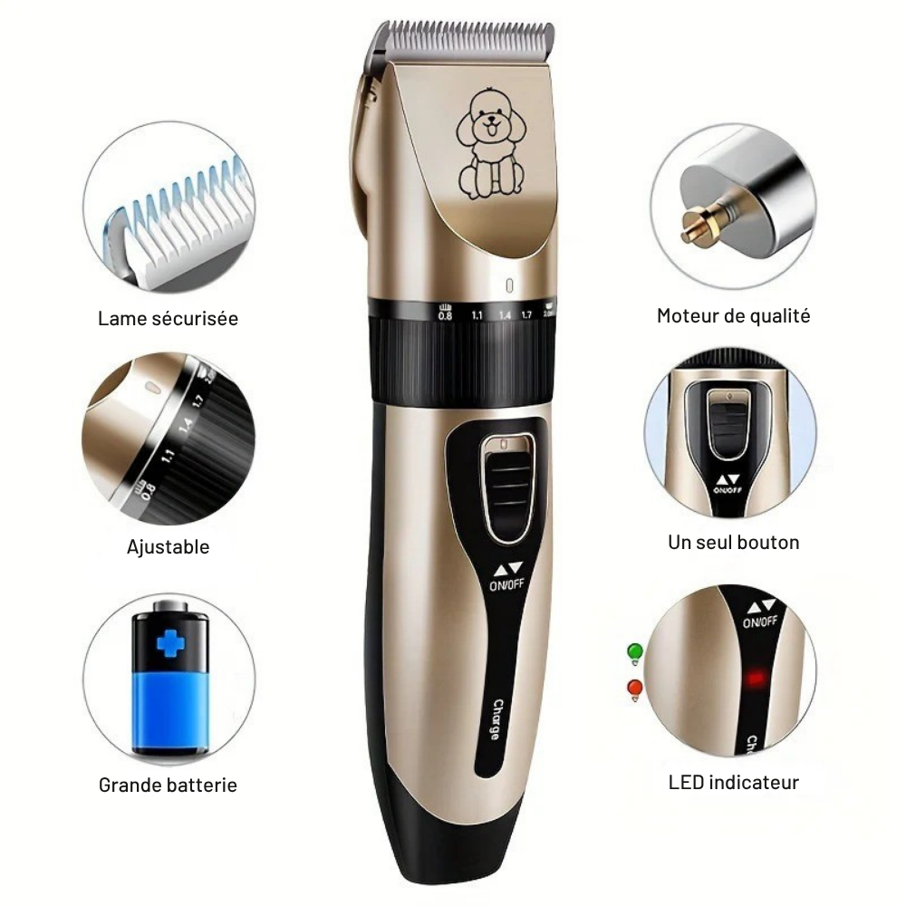 Tondeuse dorée silencieuse pour animaux, réglable 5 vitesses, avec 6 sabots. Idéale pour chiens, chats, lapins. Rechargeable USB, coupe sans stress ni blessures.