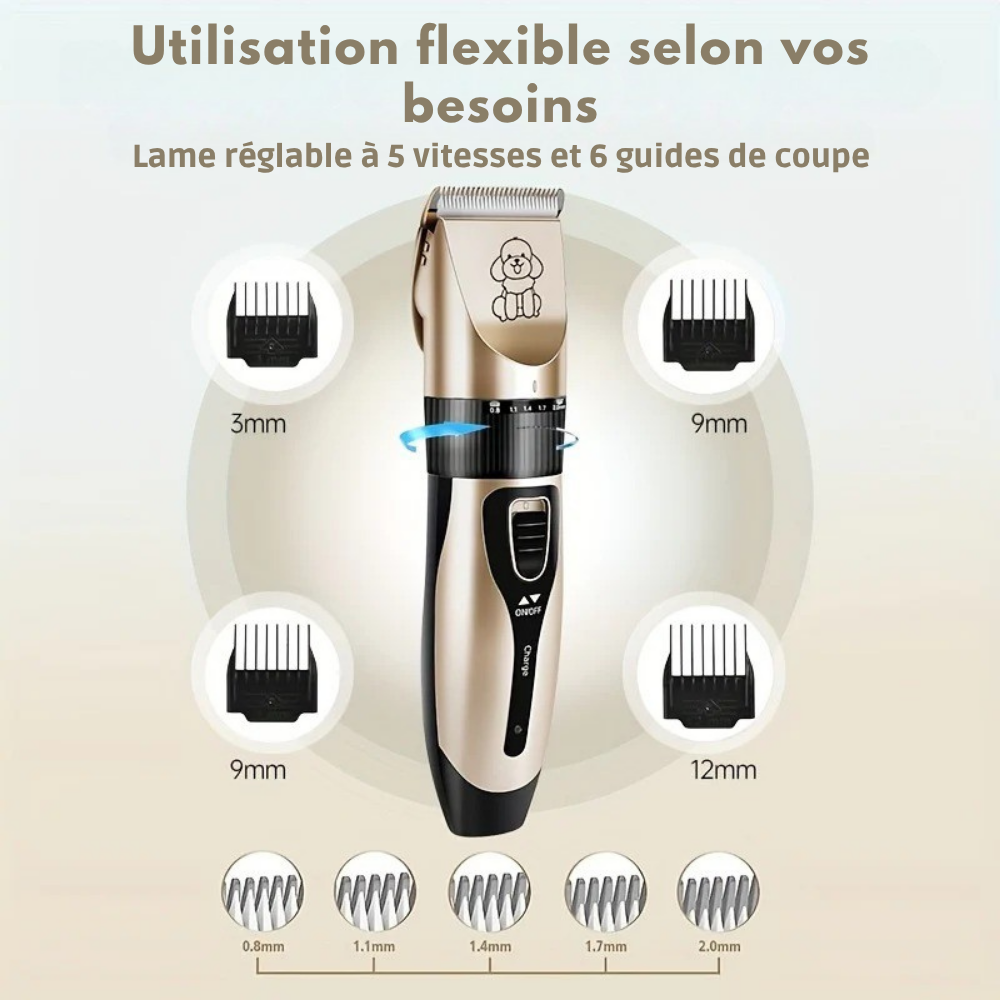 La tondeuse silencieuse pour animaux est livrée avec 6 sabots de 3 à 12 mm, pour une coupe ajustée selon le type de poil.